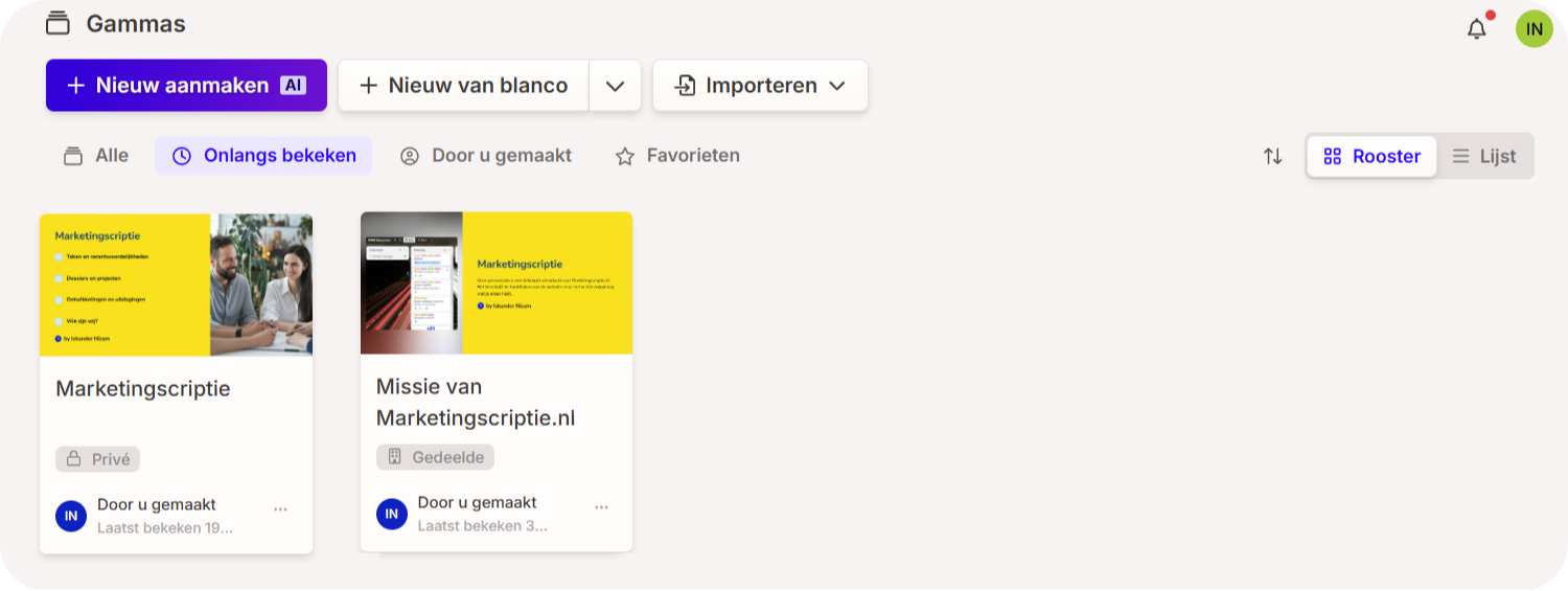 • Genereren: dan bedenkt Gamma zelf een presentatie en inhoud op basis van je prompt. Dat betekent een opdracht die je invoert.