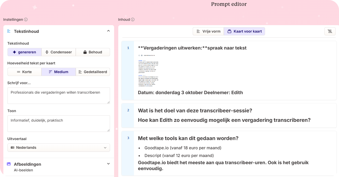 Het is belangrijk dat de presentatie niet alleen bestaat uit afbeeldingen. Uit onze ervaring blijkt dat Gamma vooral goed overweg kan met (veel) tekst in combinatie met afbeeldingen. Zo kijkt de tool of het bijvoorbeeld tekst kan samenvoegen in je huidige presentatie tot één visuele slide.